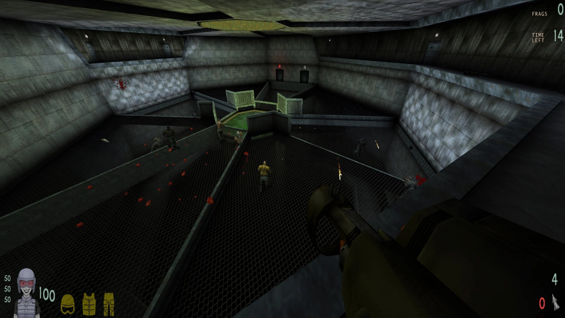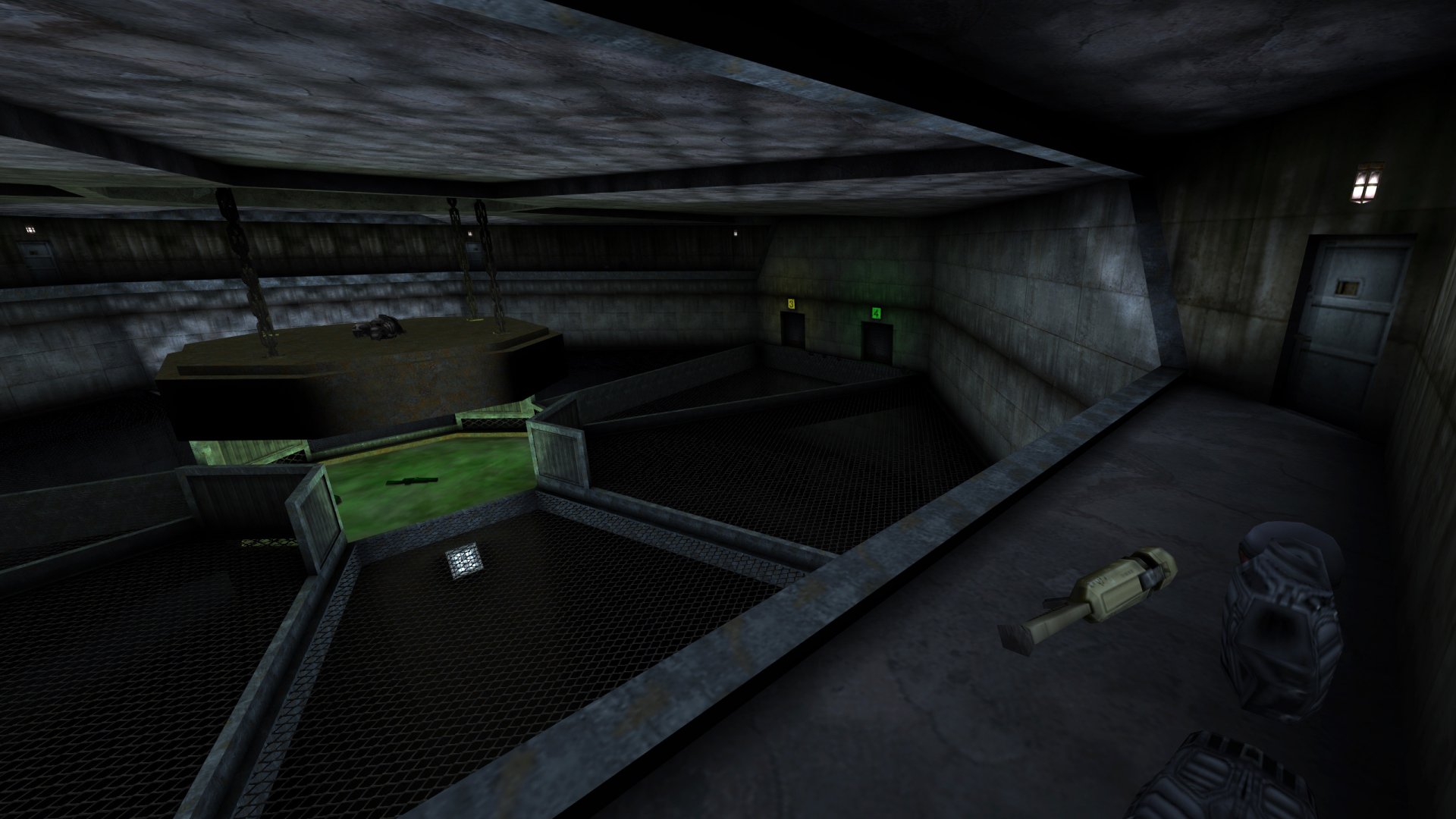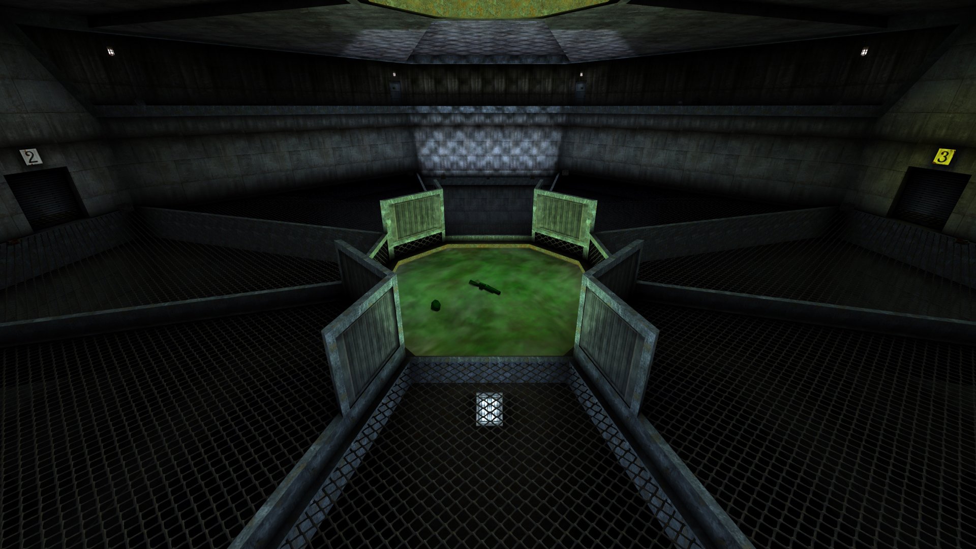Players spawn into the 4 side rooms and either walk to the arena's floor level and grab a shotgun or zip to the upper level overlooking the arena for light armor and the rocket launcher.